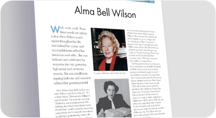 OKLAHOMA HALL OF FAME MEMBER SPOTLIGHT Alma Bell Wilson ork, work, work. Those was an attorney and served as mayor Wthree words are advice of Pauls Valley in the 1920s, inspired Wilson to be a lawyer. He wanted both Justice Alma Wilson would of his daughters to go to college, and repeat throughout her life, for at least one of them to become a lawyer. At the age of just eight years old, and indeed her career and Wilson announced to her family that was accomplishments reflect her what she would be when she grew up. Today, a little girl dreaming of becoming tenacious work ethic. She was a lawyer is not a far-fetched idea. beloved and celebrated by However, in the 1920s there were few role models for young Wilson. everyone she met, garnering The first woman to become a lawyer in high praise and numerous the United States was Arabella Mansfield in 1869, but she would never actively awards. She was a trailblazer, Courtesy Oklahoma Hall of Fame Archives. practice and instead taught at what is inspiring both men and women to now DePauw University. Ten years later, Belva Lockwood became the first woman achieve their greatest potential. lawyer admitted to the bar of the United States Supreme Court. It was not until Alma Wilson (neƩ Bell), and her twin 1893 that the first woman would be sister Wilma, were born May 25, 1917 admitted to the Oklahoma Territory Bar, in Pauls Valley, Oklahoma to William R. Minerva K. Elliott Lentz. Grace Elmore and Anna Bell. The year she was born Gibson became the first woman to Oklahoma was preparing for its 10th serve in a county or district judgeship in birthday, the United States had entered Oklahoma in 1930, and in 1936 she was World War I, and it would be three more temporarily appointed to the Criminal years before the Nineteenth Amendment Court of Appeals and wrote the first would pass, guaranteeing women the opinion ever written by a female member right to vote in federal elections. Wilson of the court. By 1935, there had only and her sister were raised on Walnut been approximately 100 women lawyers Street in a stucco home with a large licensed in Oklahoma. covered front porch. Their father, who Wilson never lost sight of her goal while growing up in a small Oklahoma Alma Bell Wilson was one of the first women to serve as a federal law clerk in the state of Oklahoma. Courtesy Oklahoma Historical Society. BY MATTIE BARLOW 34