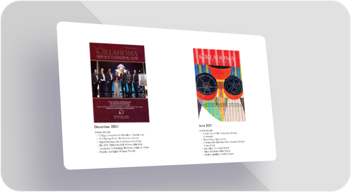 PAST ISSUES June 2022 December 2022 Articles include% Articles include% : Reflection Symmetry: Lawrence Naff & Jason Wilso" : Carlos Barboza's Field of Dreamd : ASCANs in Oklahom/ : Birth of the Great State Fair of Oklahom/ : An Extraordinary Public Servant: Oleta Lawanda : Making Wine for a Cause: Girls Gone Win\ Crai" : Sage & Elm Apothecary: Krystle Robinson-Hershe4 : The 2022 Oklahoma Hall of Fame Induction : Member Spotlight: Alma Bell Wilson Ceremon4 : Member Spotlight: Merle Newby Buttram